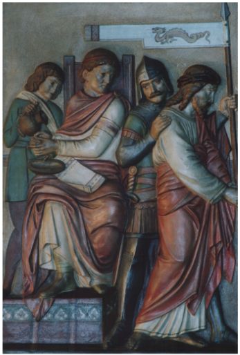 Jesus steht vor Gericht. Pilatus verurteilt den unschuldigen Jesus nach der Geißelung und der Dornenkrönung zum Tod am Kreuz. Jesus hat das Volk geliebt und es gut gemeint. Sein Herz trifft die furchtbare Ungerechtigkeit dieses Urteils. Er aber schweigt und nimmt das Urteil an.
